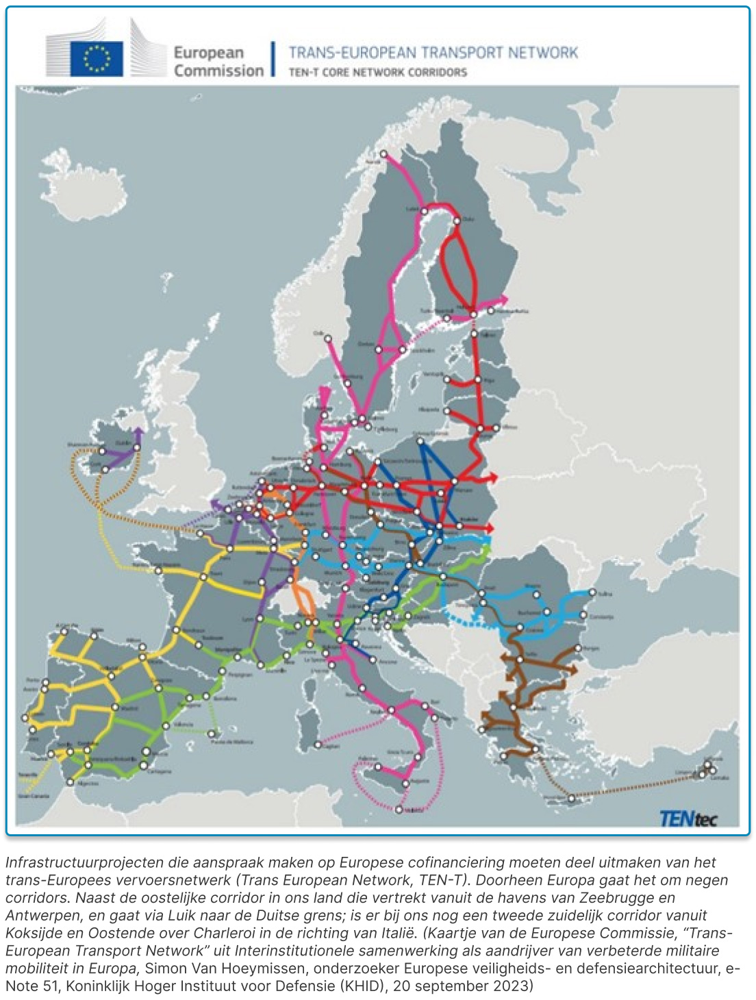 Ook spoorinfrastructuur komt in beeld. De heractivering van de IJzeren Rijn, de historische spoorverbinding tussen Antwerpen en het Duitse Ruhrgebied via Nederland, wordt strategisch herbekeken. De Europese Rekenkamer bevestigt dat spoorwegen een essentieel alternatief vormen voor wegtransport, en dat 70% van de militaire mobiliteitsfinanciering in de EU naar spoor- en wegprojecten is gegaan. Een functionele IJzeren Rijn zou niet alleen de transportcapaciteit vergroten, maar ook de veerkracht van het logistieke netwerk versterken en de druk op de wegverbindingen verlichten.