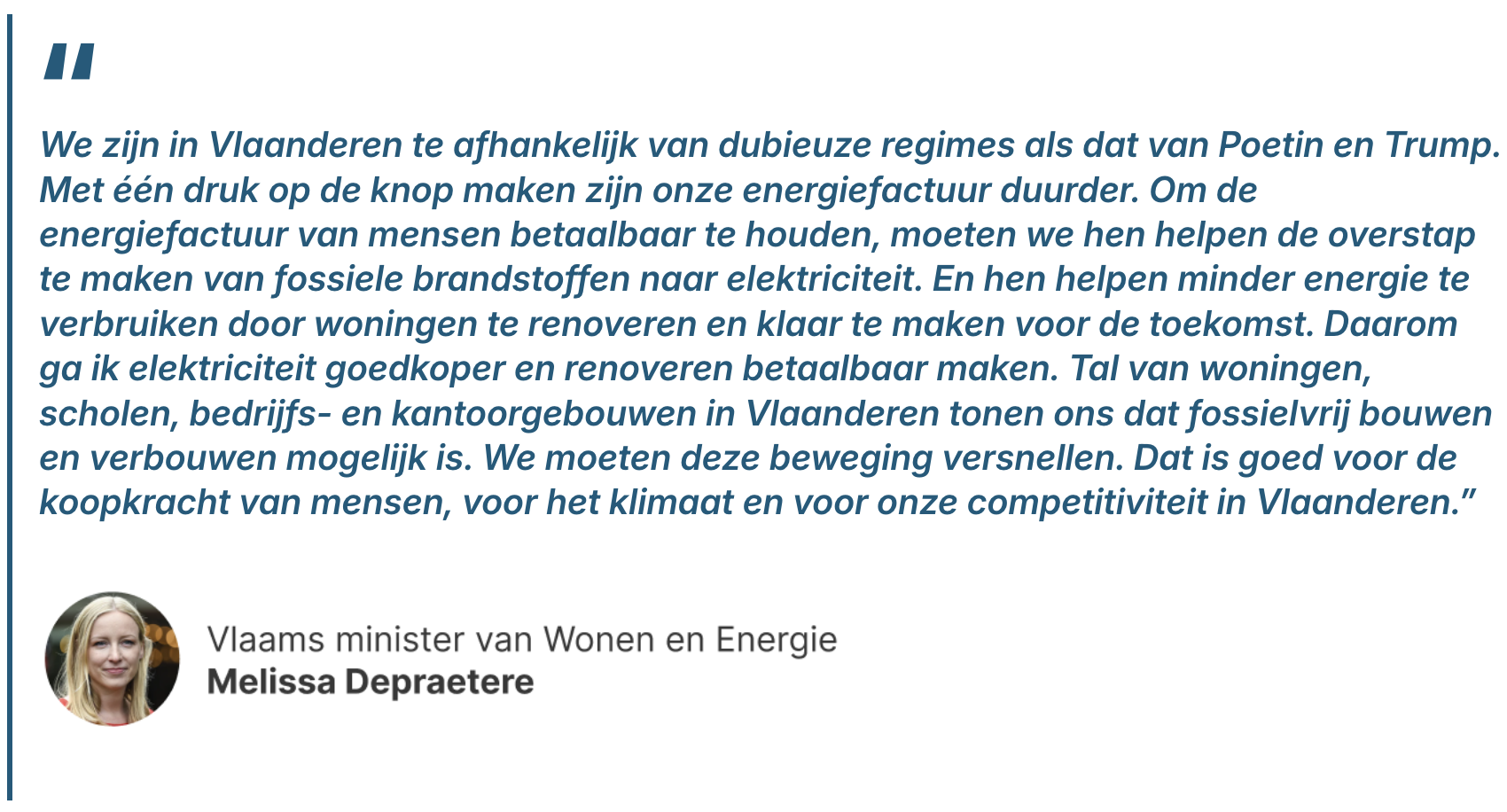 We zijn in Vlaanderen te afhankelijk van dubieuze regimes als dat van Poetin en Trump. Met één druk op de knop maken zijn onze energiefactuur duurder. Om de energiefactuur van mensen betaalbaar te houden, moeten we hen helpen de overstap te maken van fossiele brandstoffen naar elektriciteit. En hen helpen minder energie te verbruiken door woningen te renoveren en klaar te maken voor de toekomst. Daarom ga ik elektriciteit goedkoper en renoveren betaalbaar maken. Tal van woningen, scholen, bedrijfs- en kantoorgebouwen in Vlaanderen tonen ons dat fossielvrij bouwen en verbouwen mogelijk is. We moeten deze beweging versnellen. Dat is goed voor de koopkracht van mensen, voor het klimaat en voor onze competitiviteit in Vlaanderen.”